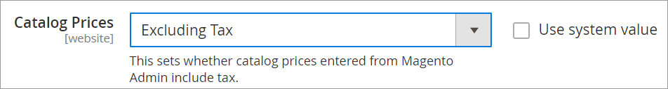2. Verify **Catalog Prices** is set to `Excluding Tax` —this is the default setting.\
