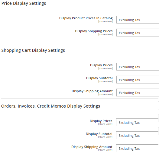 3. On the same **Tax** page, click to expand the **Price Display Settings** section, the **Shopping Cart Display Settings** section, and the **Orders**, **Invoices**, **Credit Memos Display Settings** section. In each section, verify the following are also conﬁgured for `Excluding Tax`—these are the default settings.\