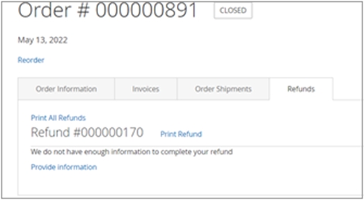 Note: It may take up to 3 minutes for the Provide information link to appear. Additionally, when the refund.pending_information webhook is received, it triggers a refund_pending_information event in Adobe. You can use this event to trigger an email to be sent to you to let you know you need to provide additional information in order to process the order refund.