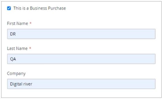 Select the This is a Business Purchase check box on the Shipping Address screen, when purchasing physical goods, or on the Payment Information screen when purchasing digital or virtual goods.