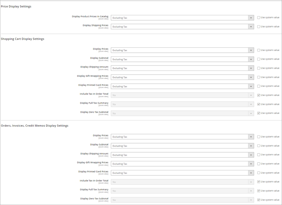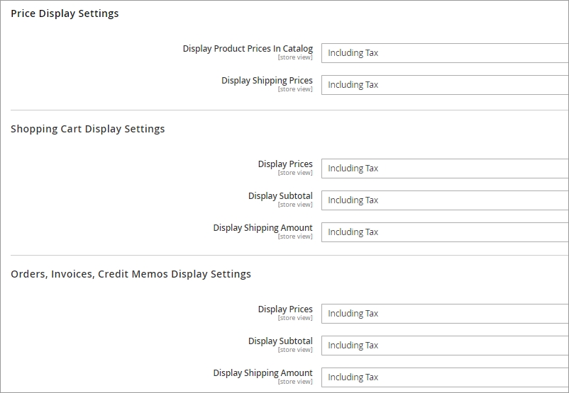 On the same Tax page, click to expand the Price Display Settings section, the Shopping Cart Display Settings section, and the Orders, Invoices, Credit Memos Display Settings section. In each section, verify the following are also configured for