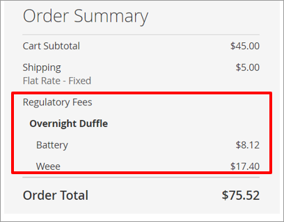 Regulatory fees will display in the shopper’s order totals. The fee name displayed is pulled from the feeType attribute in the Digital River Fee Service.