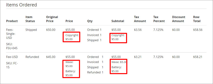 Specific regulatory fees per item will appear on the order in the Magento Admin UI.