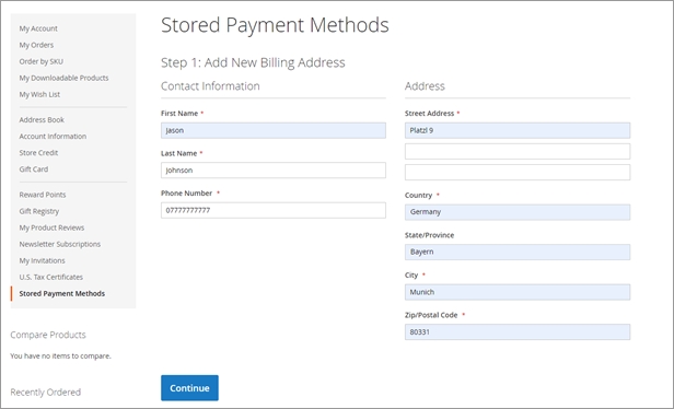 To use a stored payment method during checkout, select the radio button next to the payment method you want to use and click Use Stored Payment.