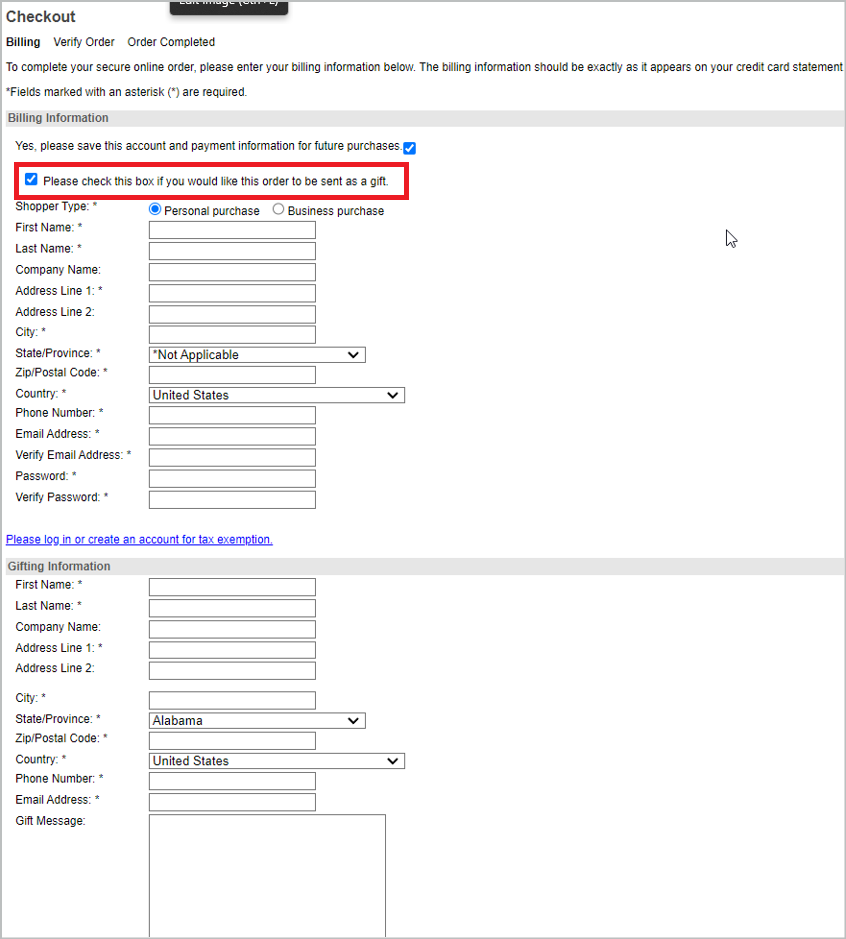 Gifting allows customers to buy products as gifts for others. This feature restricts gift orders to one recipient per order, requiring the shopper to select the gift checkbox that appears during checkout and enter recipient details such as name, address, and email address during checkout. The purchaser can also enter a personal message.&#x20;