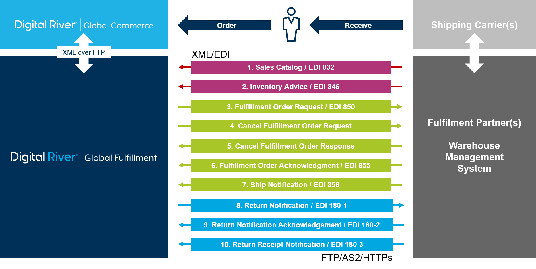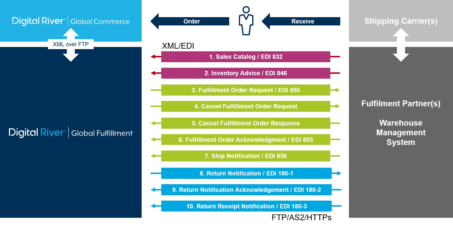 Physical fulfillment connects a commerce site to logistics partners who drop-ship products to the shopper. It also enables a commerce site to smart-source orders through one or more partners in the pre-integrated distribution partner network, who fulfill products globally based on configurable rules. Use this documentation to connect new fulfillment partners and their warehouses with the Digital River ecosystem for order and return management.
