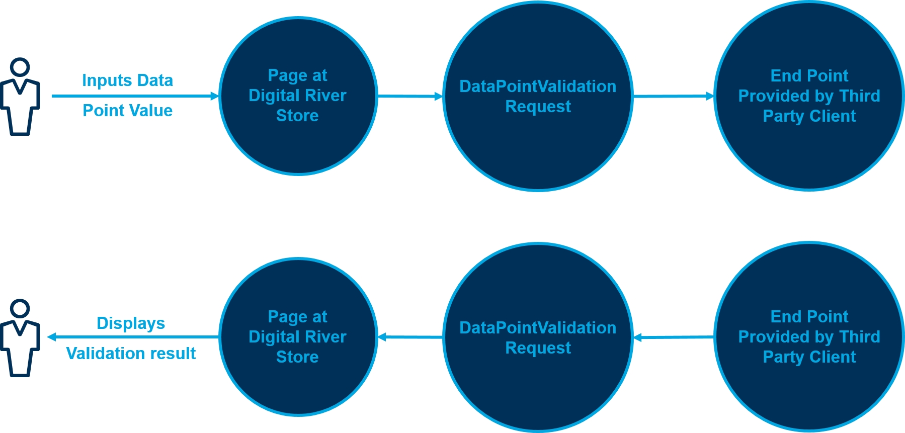 The Data Validation service is a request/response-based process. It provides a mechanism for attaching data points to a page in a Digital River store and validating each data point against an external endpoint provided by a third-party client.