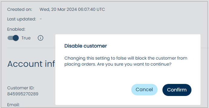 4. Click the toggle underneath **Enabled** to change the setting to False. The Disable customer dialog box appears.\\