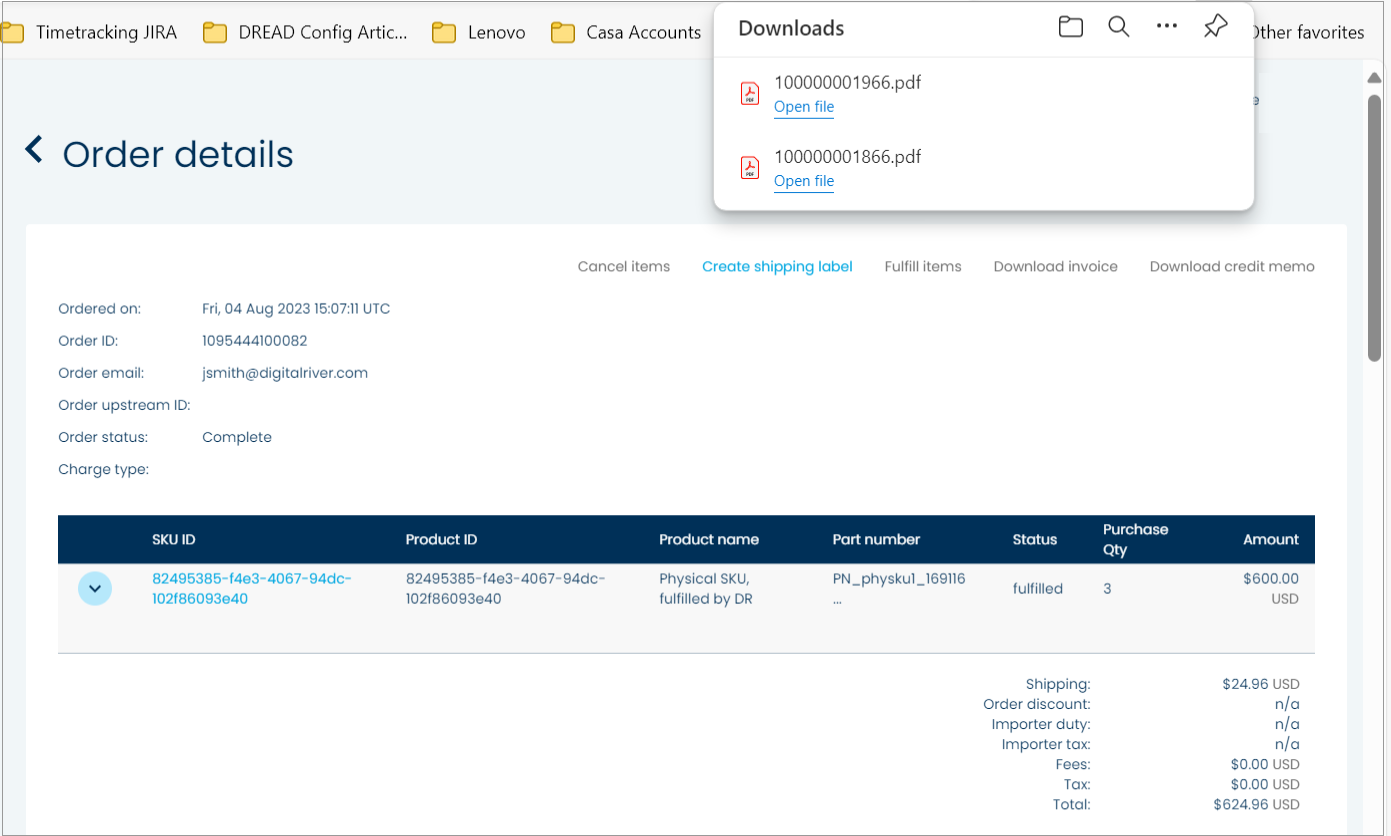 The Create shipping label link is enabled on the Order details page when that order has been fulfilled and is ready for shipping.