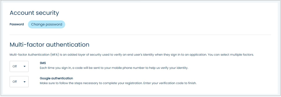 To enable these settings, go to your **Profile settings** page after you have created your Digital River account. Scroll to **Multi-factor authentication** in the **Account security** section. The default setting for both methods is **Off.**