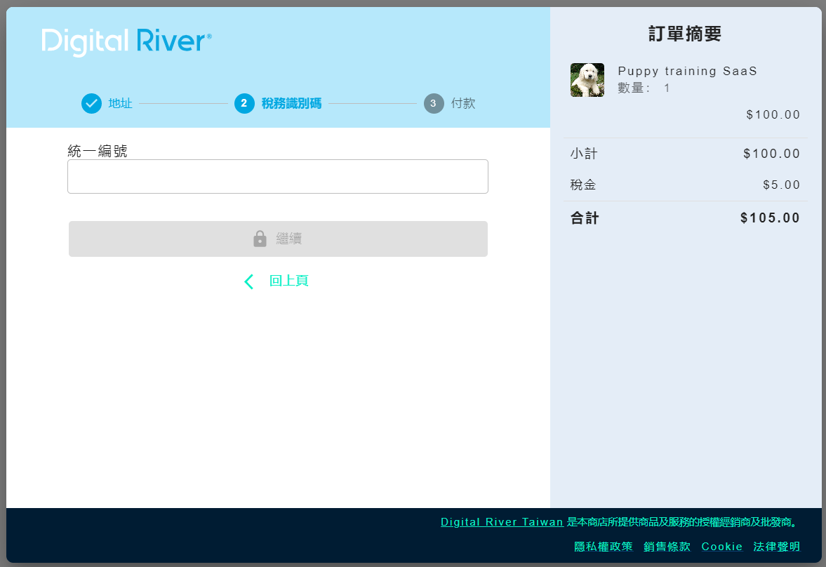 If `customerType` is `business` and customers use the Prebuilt Checkout's drop-down menu to select Taiwan as their shipping or billing country (or you pass  [`shoppingCountry`](https://app.gitbook.com/s/x8fSFzVR3sg0TsNWwwVz/drop-in-checkout-sessions/checkout-sessions-basics#shopping-country) of `TW` in the create[ checkout-session request](https://app.gitbook.com/s/x8fSFzVR3sg0TsNWwwVz/drop-in-checkout-sessions#drop-in-checkout-sessions)), Digital River collects and validates the customer's tax identification number.