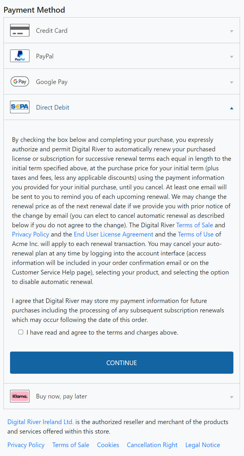 Digital River also presents customers with a localized, recurring billing agreement in the payment collection stage and forces them to accept it before they can submit the order.