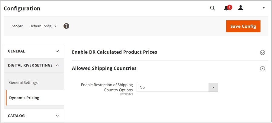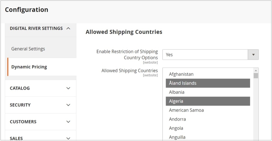 As part of setting up dynamic pricing, configure the extension to restrict the allowed shipping countries list while allowing the billing country list to follow Adobe Commerce's native configuration.