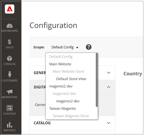Select the website or store to configure from the drop-down Scope list on the Configuration page. You are selecting the specific website or store to configure with the settings to use separate API keys.