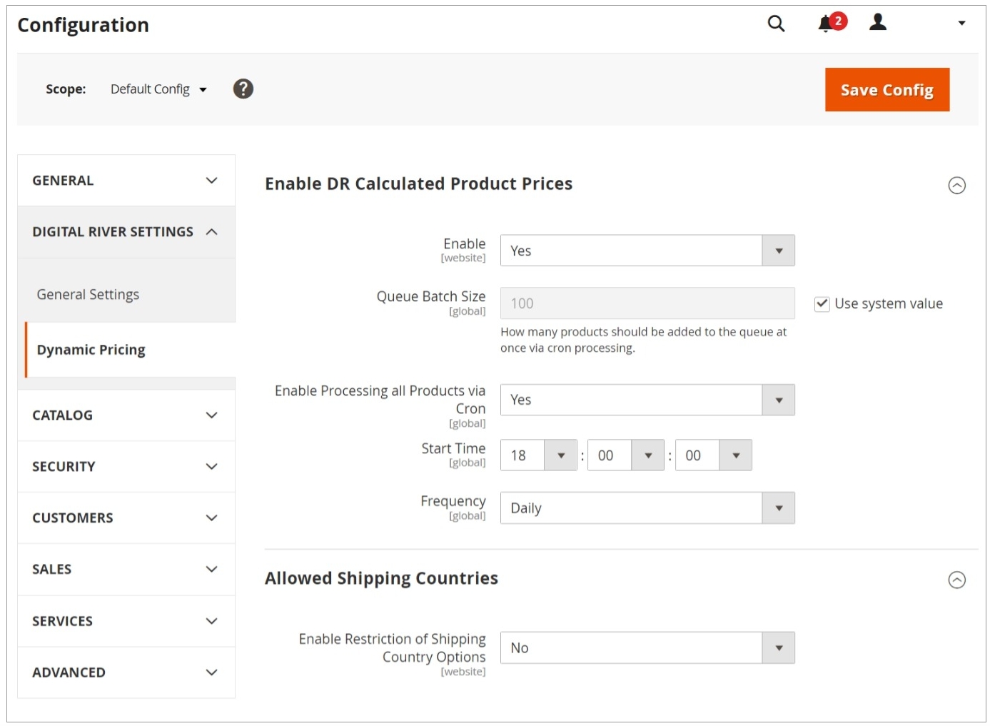 Website Scope Default Country: You must also assign your dynamic pricing account a base country. This country is the one that Digital River uses to determine configured markups defined by Digital River. The value used in the Configuration > General > Country Options > Default Country setting serves as the base country for dynamic pricing conversion across the enabled Websites.