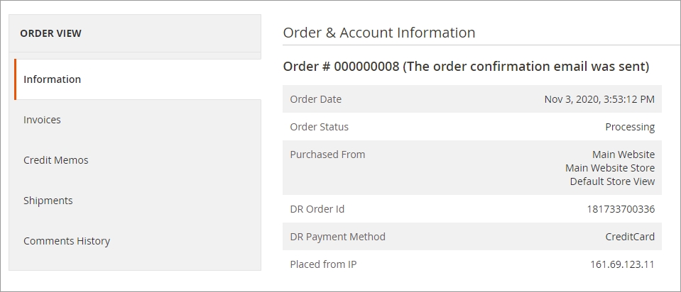 In the Order & Account Information section, verify that you see a (DR) Digital River Order ID.