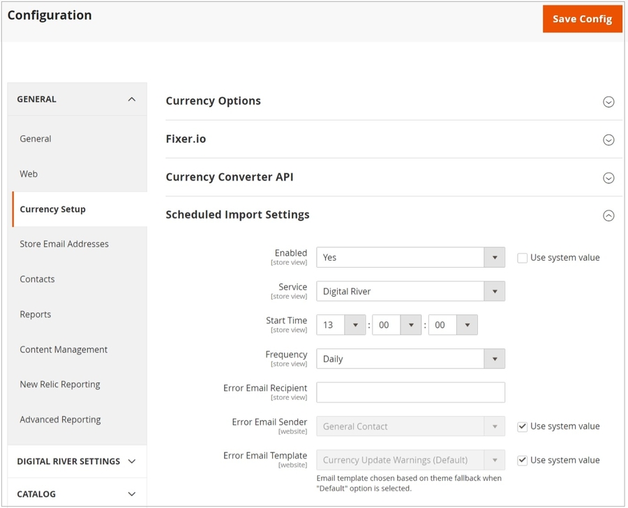 You can configure Adobe Commerce to use Digital River as the currency service provider. With Digital River as the currency rate provider, populating all native Adobe Commerce rates, you can manually import the rates or schedule a more convenient time to import them.