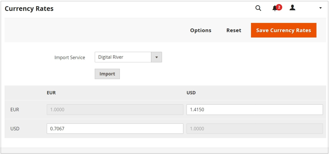 You can configure Adobe Commerce to use Digital River as the currency service provider. With Digital River as the currency rate provider, populating all native Adobe Commerce rates, you can manually import the rates or schedule a more convenient time to import them.