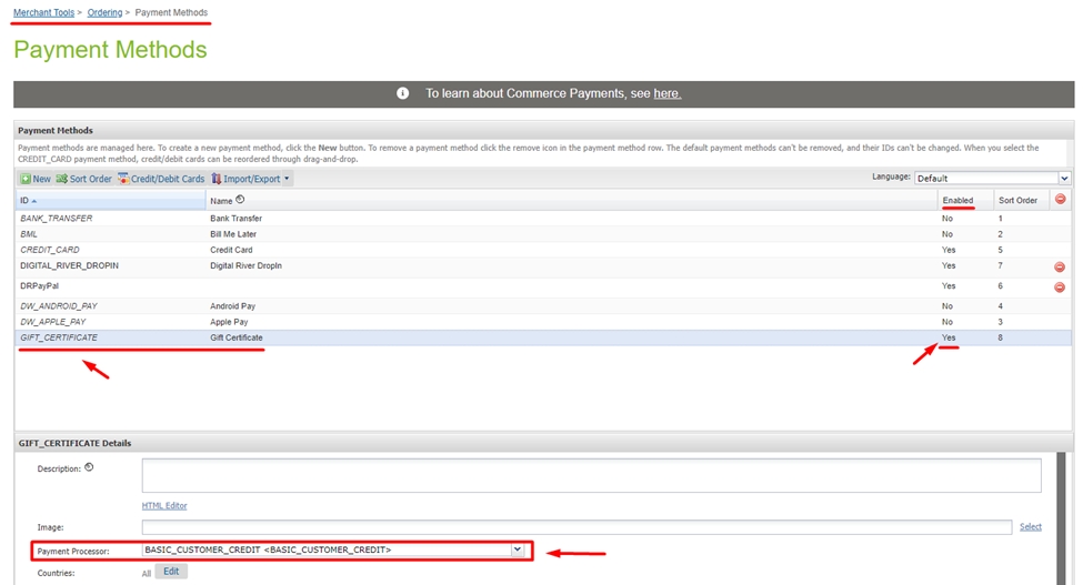 Next, go to Merchant Tools > Ordering > Payment Methods in the Business Manager and ensure the GIFT_CERTIFICATE payment method is present and enabled. If using a different payment method, complete this step according to the use case. The BASIC_CUSTOMER_CREDIT payment processor is selected for this payment method. Select the payment processor from the previous step.