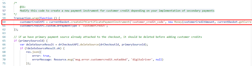 Modify the code as shown in the screenshot below to create a new payment instrument for customer credit depending on your implementation of secondary payments.