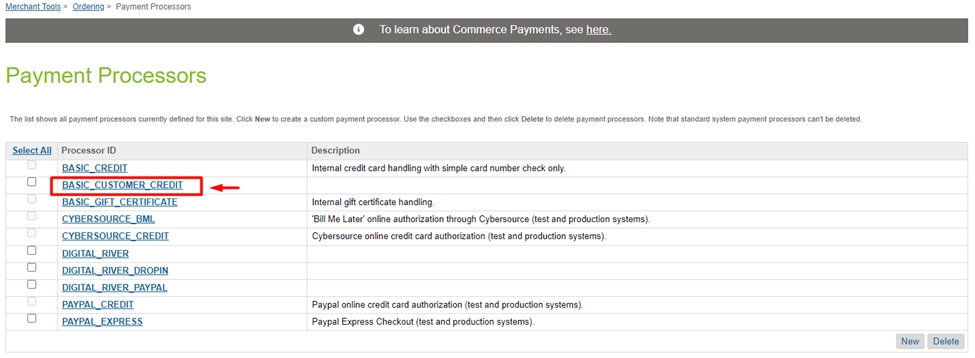 In the Business Manager, go to Merchant Tools > Ordering > Payment Processors and ensure the BASIC_CUSTOMER_CREDIT payment processor is present. If using a different payment processor, complete this step according to the use case.