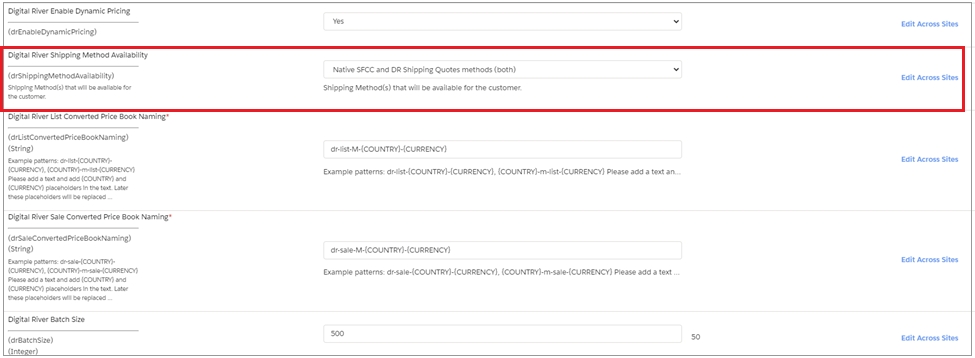 Native SFCC methods only (native): Choose this option to turn off the Digital River Shipping Options feature and display only native SFCC shipping methods.