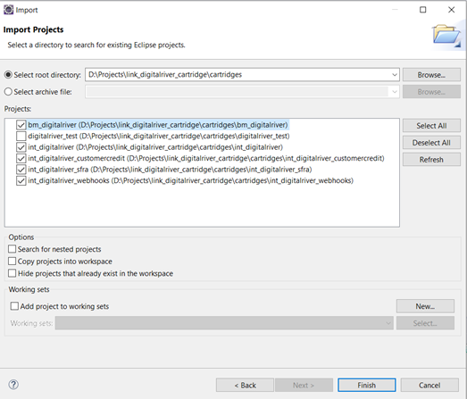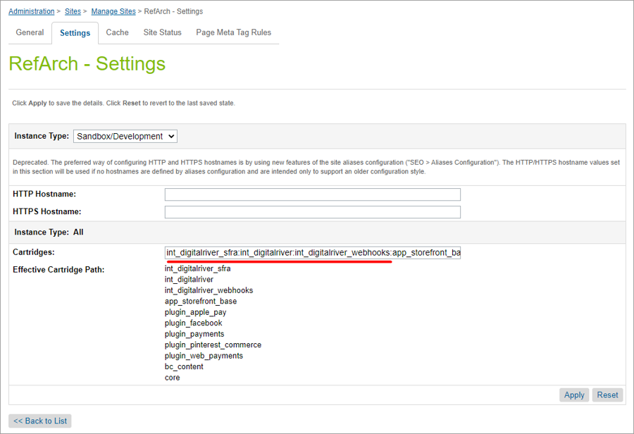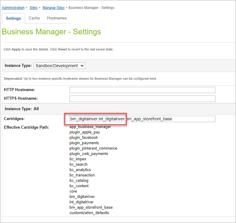 int_digitalriver_customercredit:int_digitalriver_sfra:int_digitalriver:int_digitalriver_webhooks:.Click Apply. This updates the path in the Effective Cartridge Path field. The complete path will now have the new entries at the beginning.