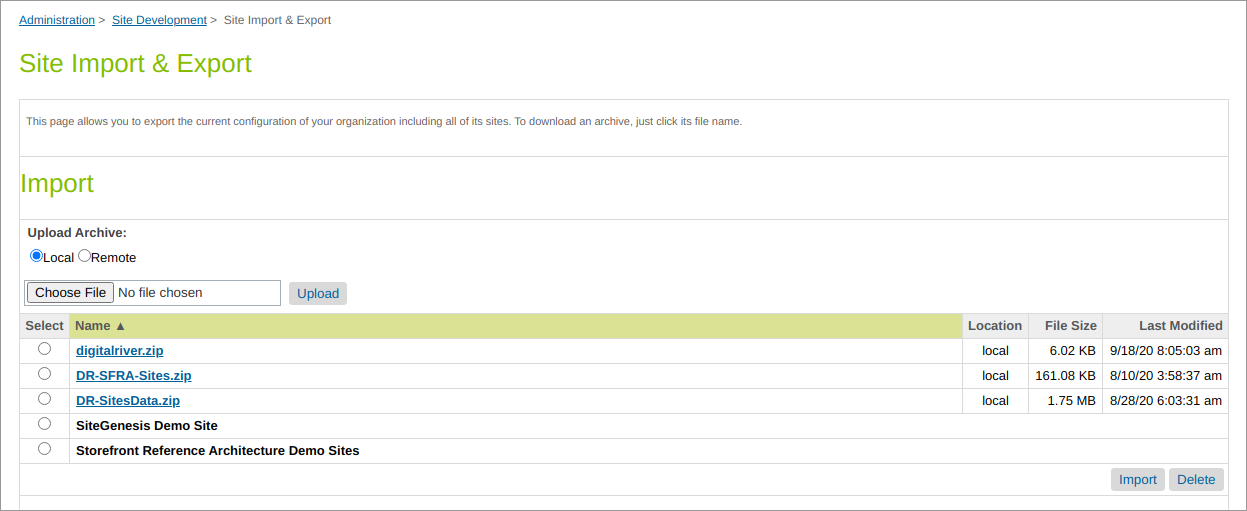 Select Administration, select Site Development, and then click Site Import & Export. Upload the digitalriver.zip file from the metadata folder.