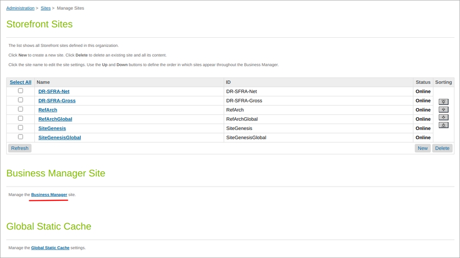 On the Manage Sites page, click the Business Manager link in the Business Manager section of the page.