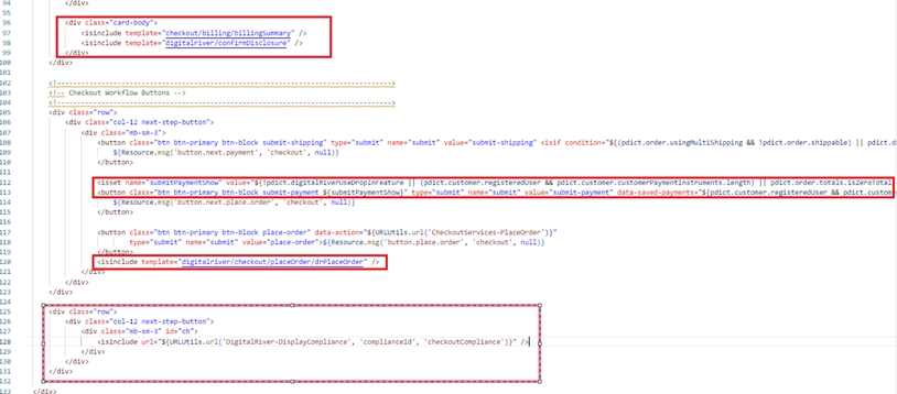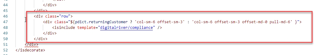 <isinclude url="${URLUtils.url('DigitalRiver-DisplayCompliance', 'complianceId', 'compliancePayment')}" />