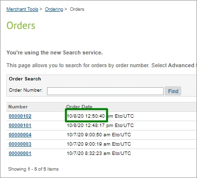 Place an order on the storefront with any account or as a guest. Once you place an order, open Business Manager and select Merchant Tools, select Ordering, and then click Orders. You can find your order by number or click Find with an empty order number field and select the last-placed order from the list.