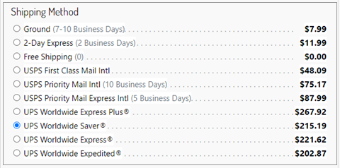 If an order is placed using a Digital River shipping option, the DRDefaultShpXXX shipping method will be displayed. Otherwise, a native SFCC shipping method will be displayed. The following shows examples of how shipping options information is displayed: