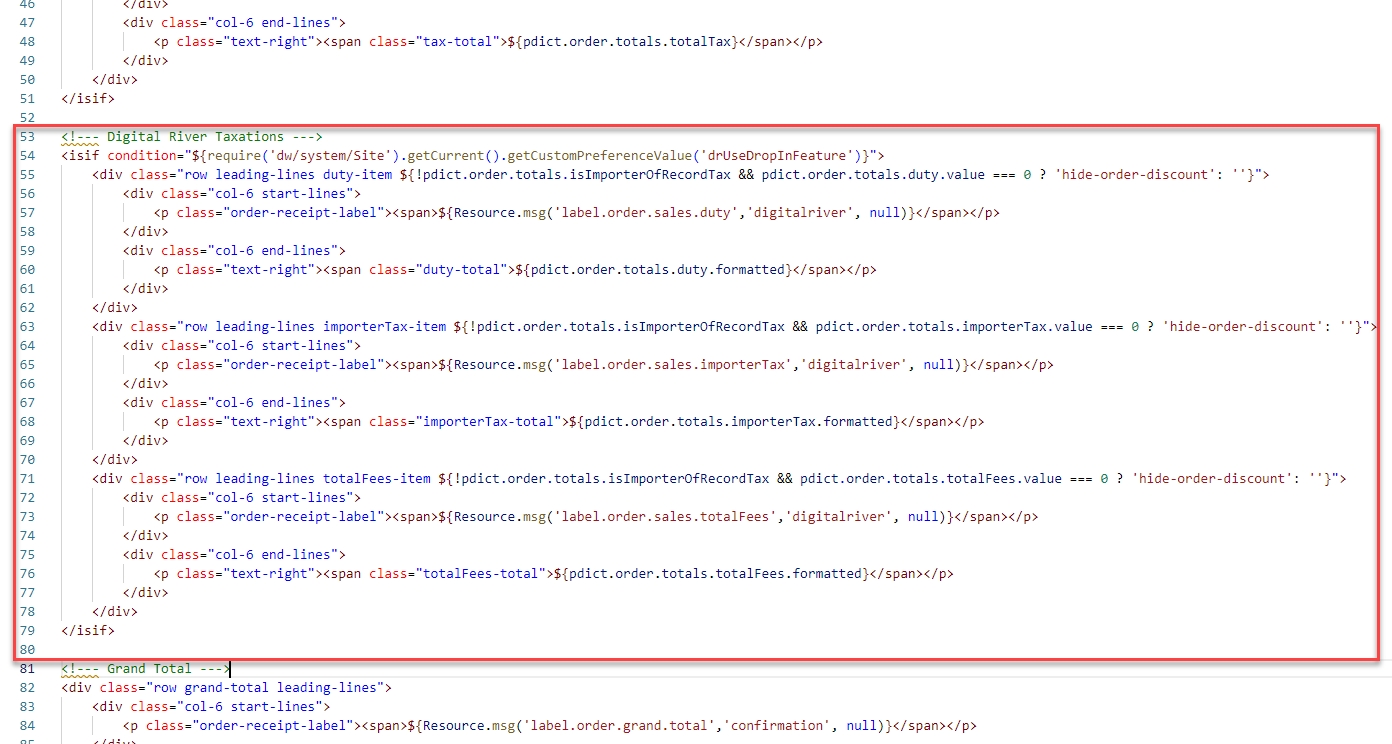 The Digital River Taxations section was included in the cart totals template after the discount section.