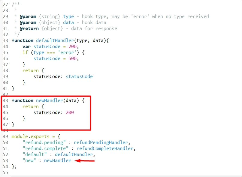 To add a handler for a specific event type, create a function with a data attribute that returns a response code (for example, 200