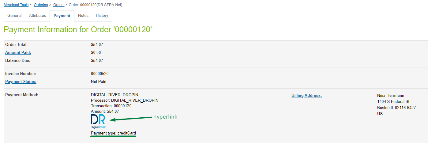 Click the Payment tab and click the Digital River logo under Payment Method to go to the Order details page for this order on the Digital River Dashboard. You may need to enter your user credentials to access the Order details page.