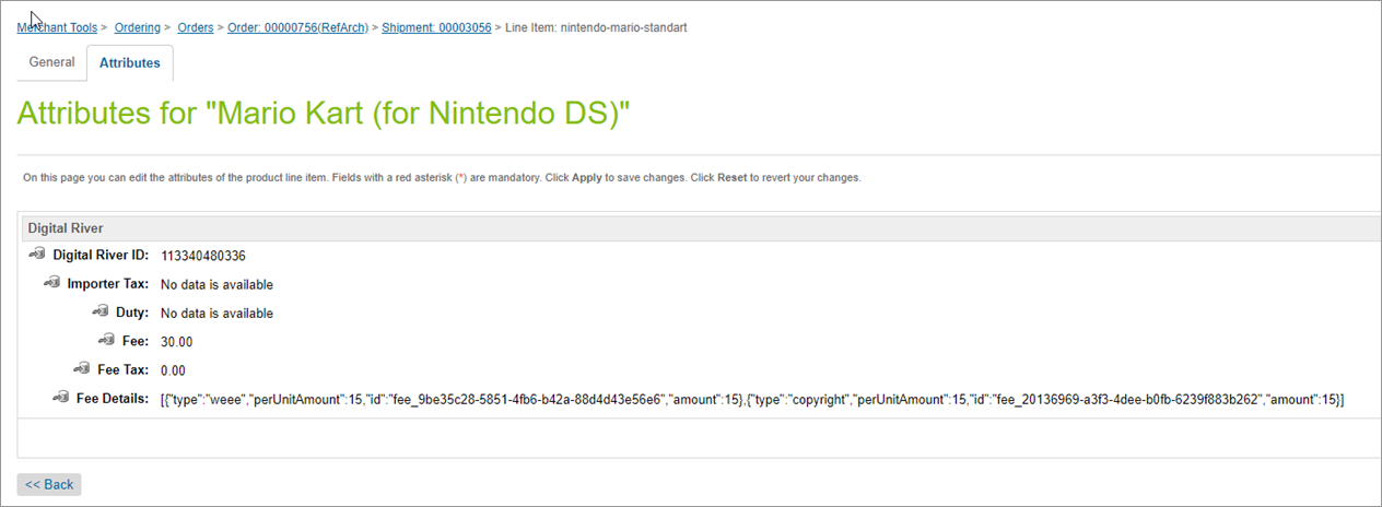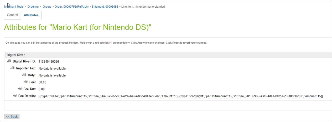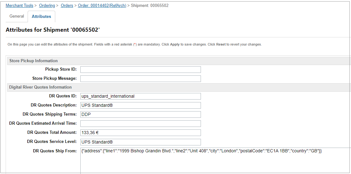 You can view details of the Digital River Shipping Option by navigating to the Shipment / Attributes tab: