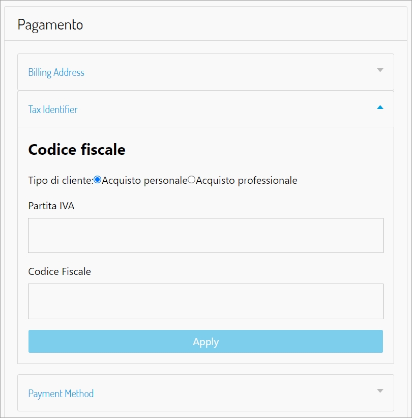 The shopper can add and remove tax identifiers and remove from the Checkout page by completing the form and clicking Apply.