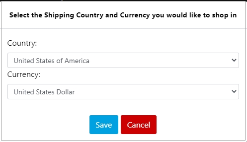 When you click Change your Shipping Country and Currency, a modal window appears, allowing the shopper to change the shipping country and currency.