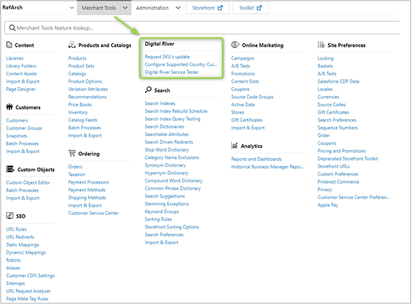 Select Digital River in the Custom Site Preferences Groups and then scroll down to the Tax Codes for Digital Products (drDigitalProductTaxCodes) preference.