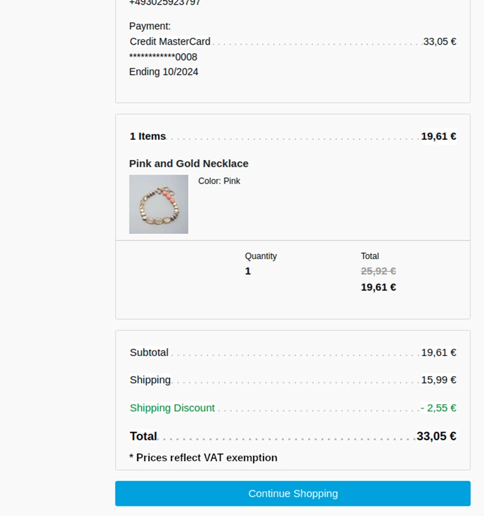 In this UI example, the sum of Subtotal, Shipping, and Shipping Discount is equal to the Total, equals which is expected. To notify customers why the prices were changed, you add the text Prices reflect VAT exemption below the order Total.