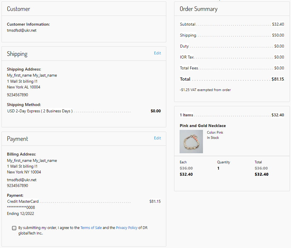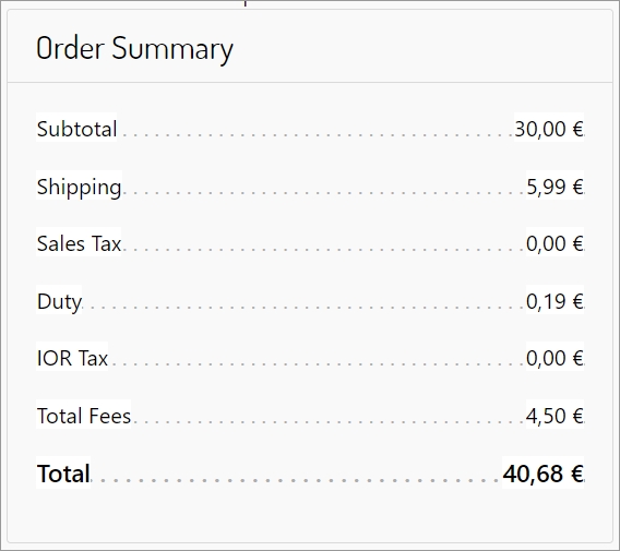 If landed cost is enabled, the Order Summary will also include the duty and Importer of Record (IOR) tax if applicable to the order.