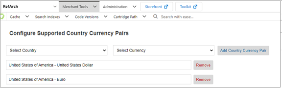 Complete these steps to configure supported Country and Currency pairs. This module appears when the Dynamic Pricing feature is enabled: