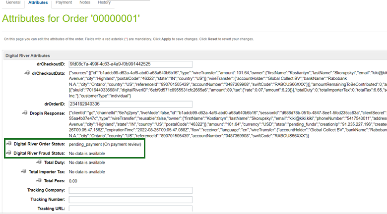 Click the Attributes tab and scroll down to Digital River Attributes, where the webhook displays the retrieved information. The Digital River Order Status should be fulfilled.