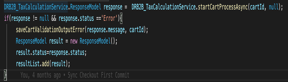 Use the outer layer, `DRB2B_TaxCalculationService` class, as a global service that can be used as a stand-alone integration. This service has a `startCartProcessAsync`method which takes `CartId (id)`and `sfdc_checkout.IntegrationInfo` which returns a `ResponseModel`custom apex object.&#x20;