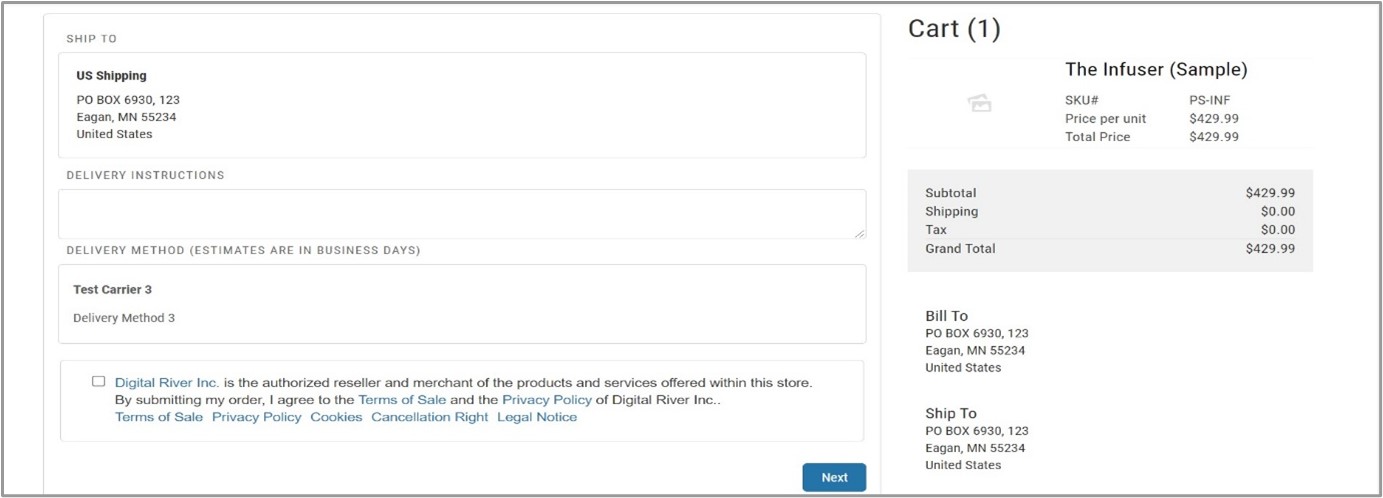 Add required information on the Buyer Info page and click Next. The Delivery Method page appears.
