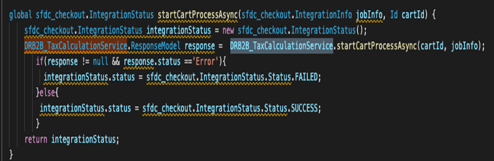 Use the outer layer, `DRB2B_TaxCalculationService` class, as a global service that can be used as a stand-alone integration. This service has a `startCartProcessAsync`method which takes `CartId (id)`and `sfdc_checkout.IntegrationInfo` which returns a `ResponseModel`custom apex object.&#x20;
