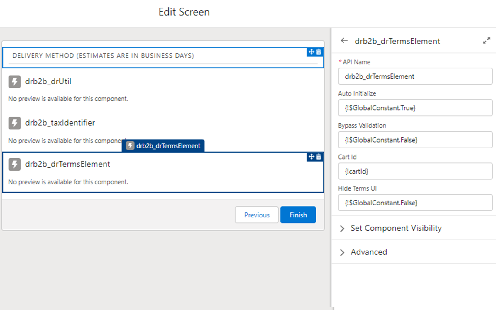 Add drb2b_drTermsElement to screen and enter the following details. Be sure to click through all designer attributes to ensure that the default values are registered by Salesforce.