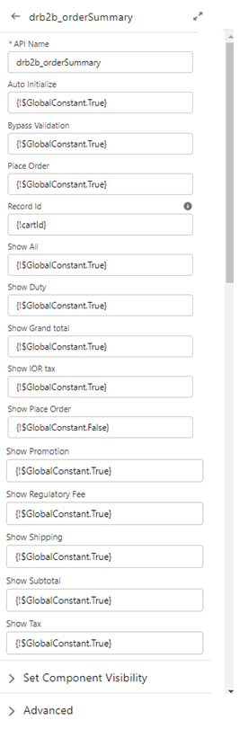 {!$GlobalConstant.False}or{!$GlobalConstant.True}(default value). Note: Set the value to{!$GlobalConstant.False}whenever you want to use thedrb2b_drTermComponenton the Place Order page. See DR terms component for more information.Place Order: