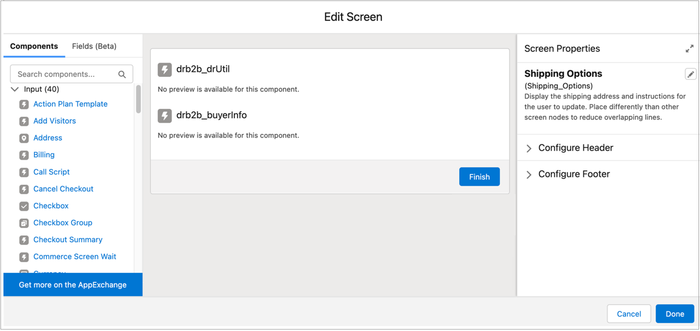1. Open the Shipping Options screen in the flow and drag the below components into the screen: