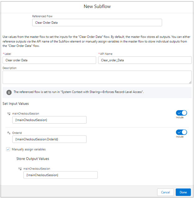 In the New Sublow screen, select "Clear Order Data" from the "Referenced Flow" drop down. Use these values.